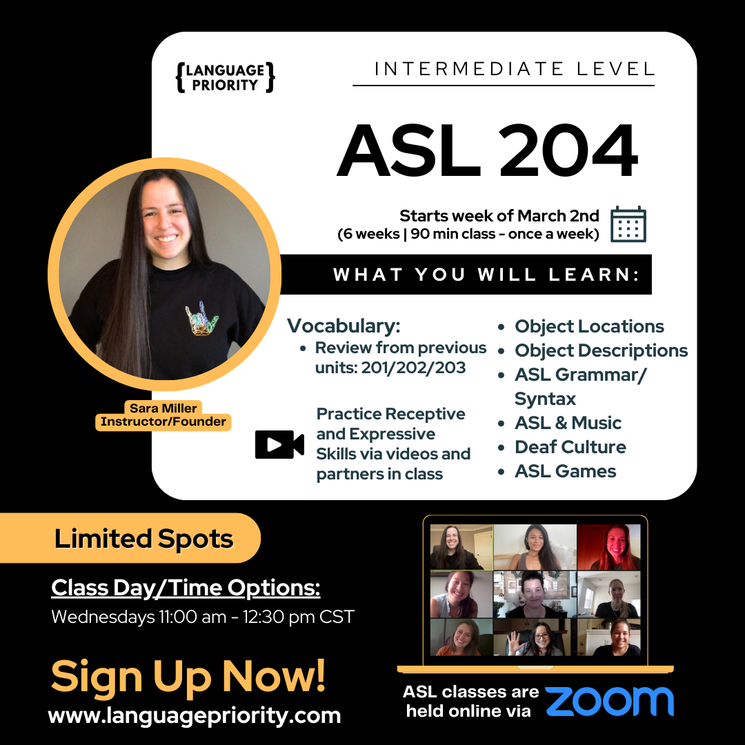 Language Priority is now opening up ASL 204 classes for March/April (Session 2) for those who have taken ASL 203 from me!