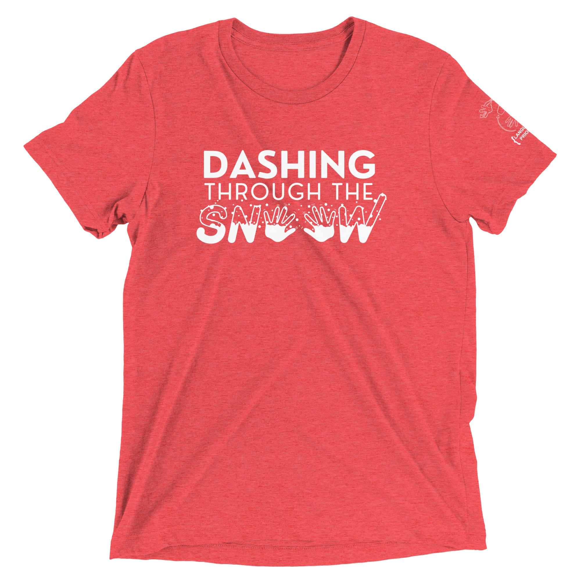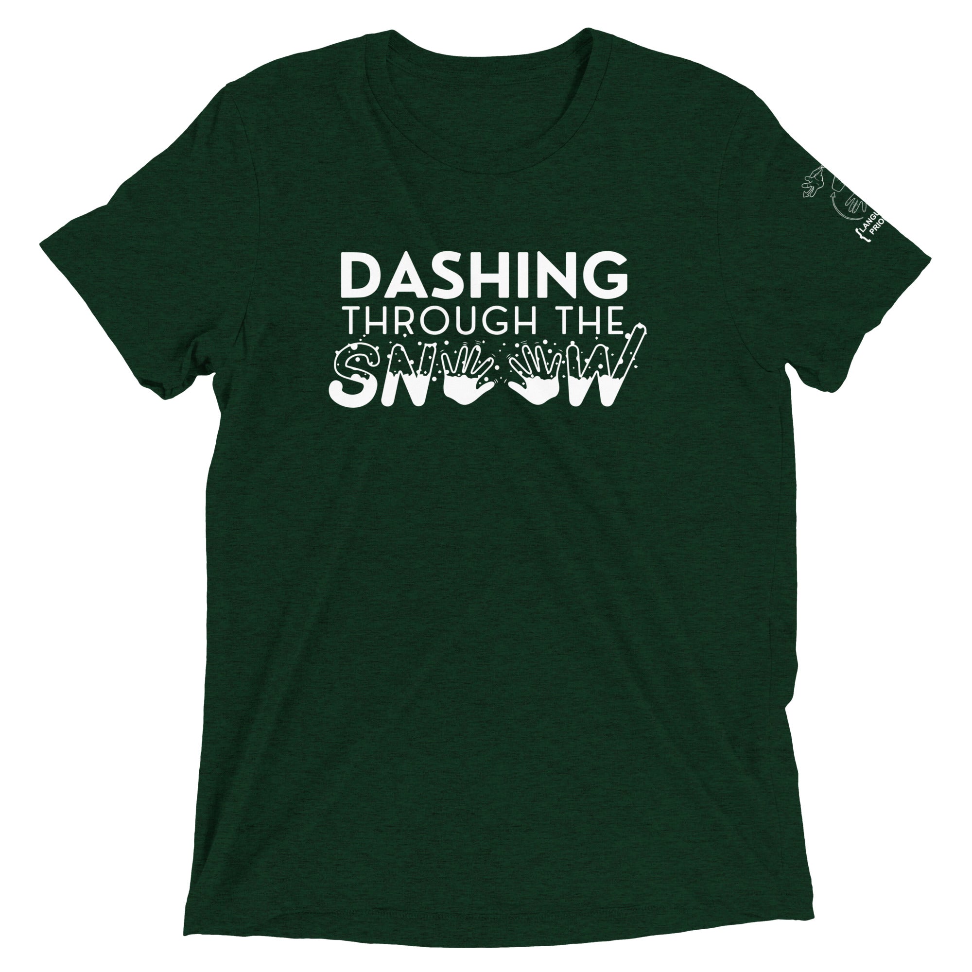 "Dashing Through the Snow" - This design features this popular phrase written in English text with two hands signing SNOW embedded in the middle of the word.