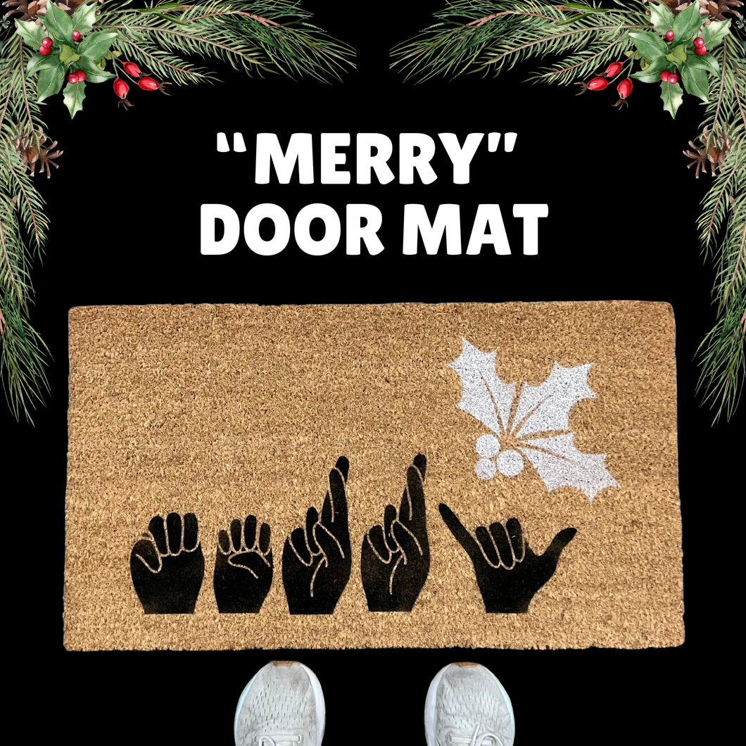 Greet your guests with festive flair! This charming door mat features the word "MERRY" in ASL fingerspelling, complete with a holly accent design that captures the magic of the season. It's a delightful way to spread holiday cheer while celebrating deaf culture and sign language. This mat brings joy to your entryway and sparks smiles from everyone who steps through your door. Make your home the merriest on the block!