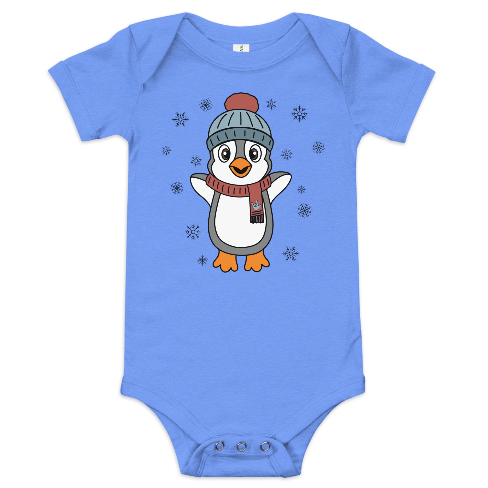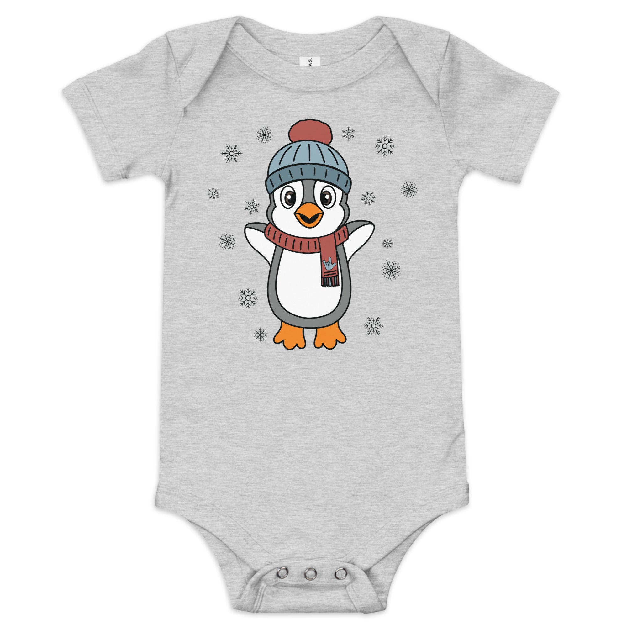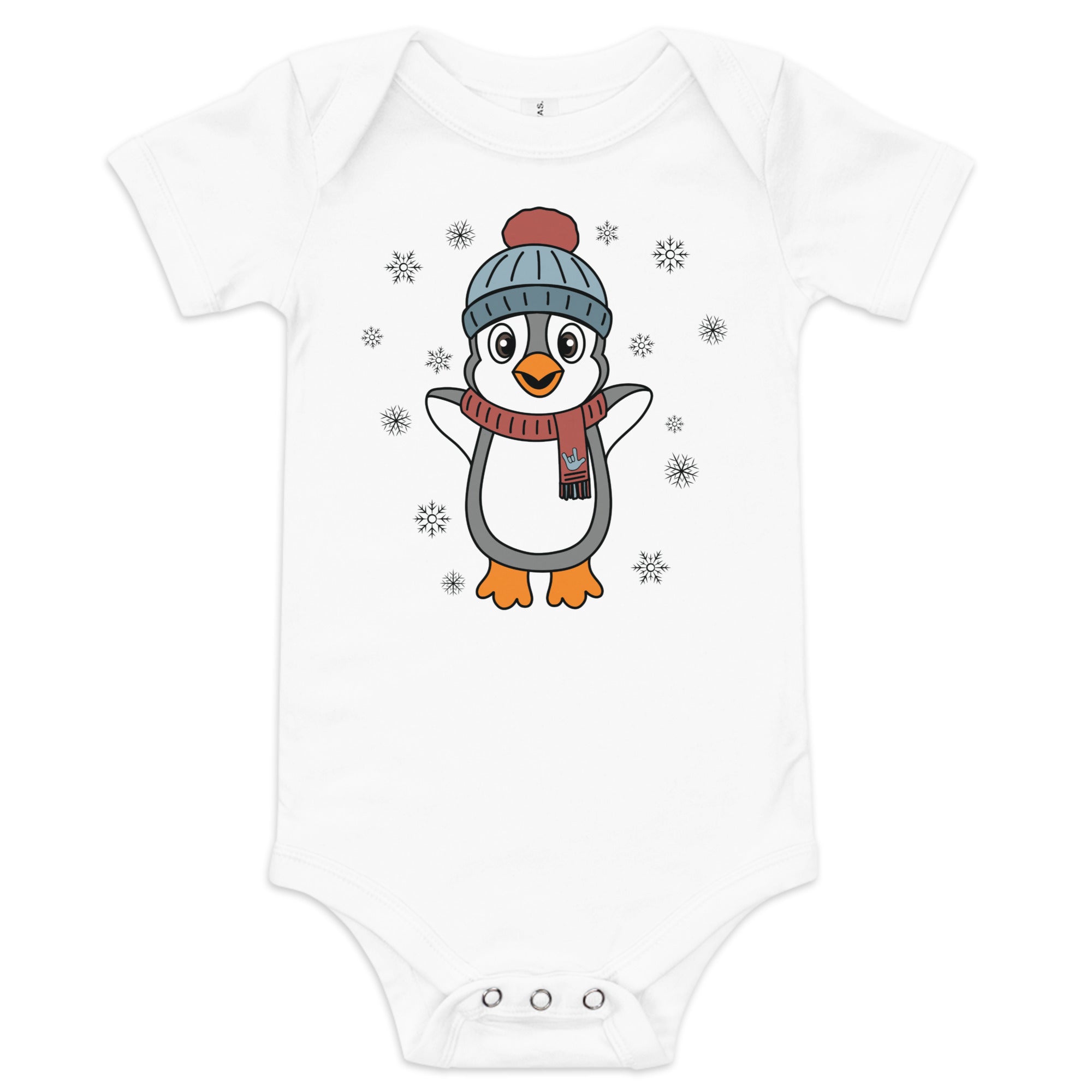 Bundle up in pure happiness with our “Joyful Penguin” baby onesie! This charming design features an irresistibly cheerful penguin, bundled in a cozy beanie and a festive scarf that proudly displays an ILY (I Love You) handshape. Surrounded by gently falling snowflakes, the little penguin appears to be jumping for joy, spreading winter cheer wherever they go.
