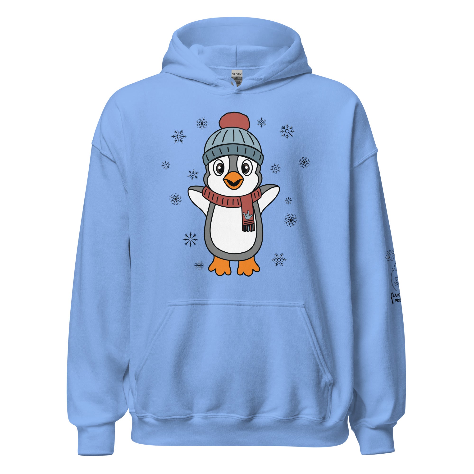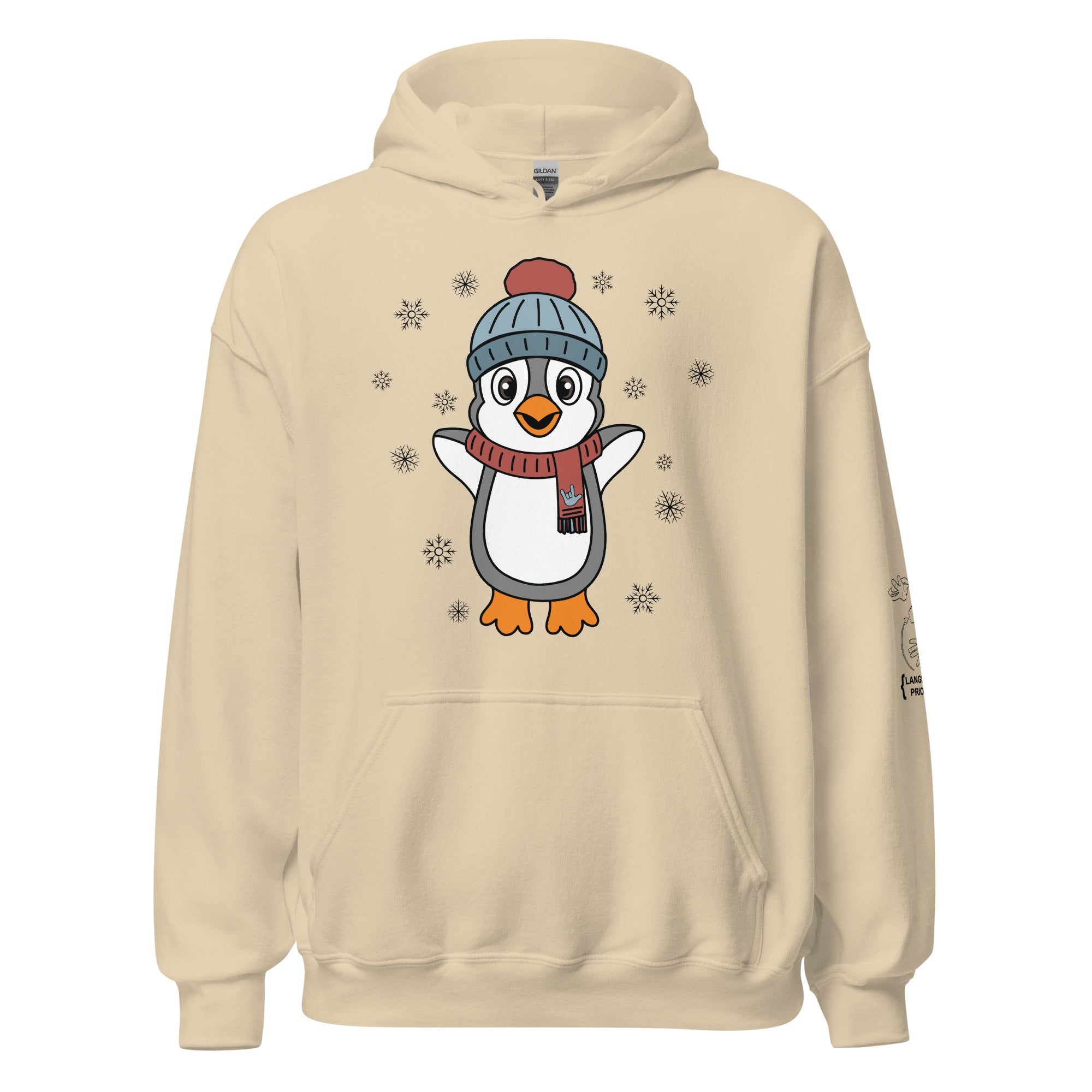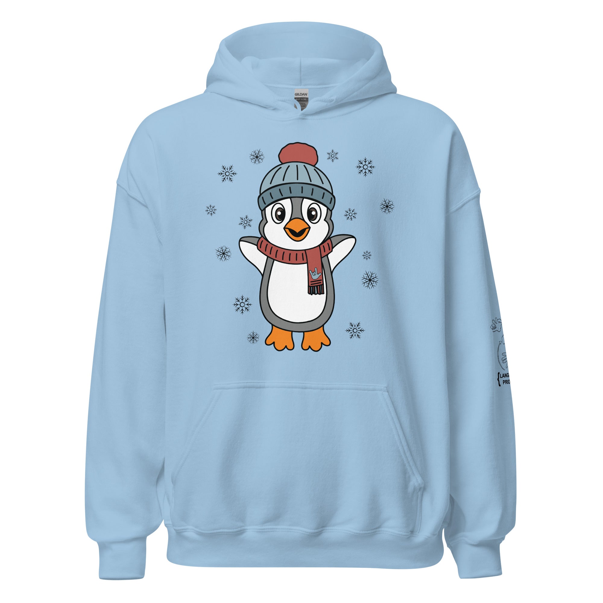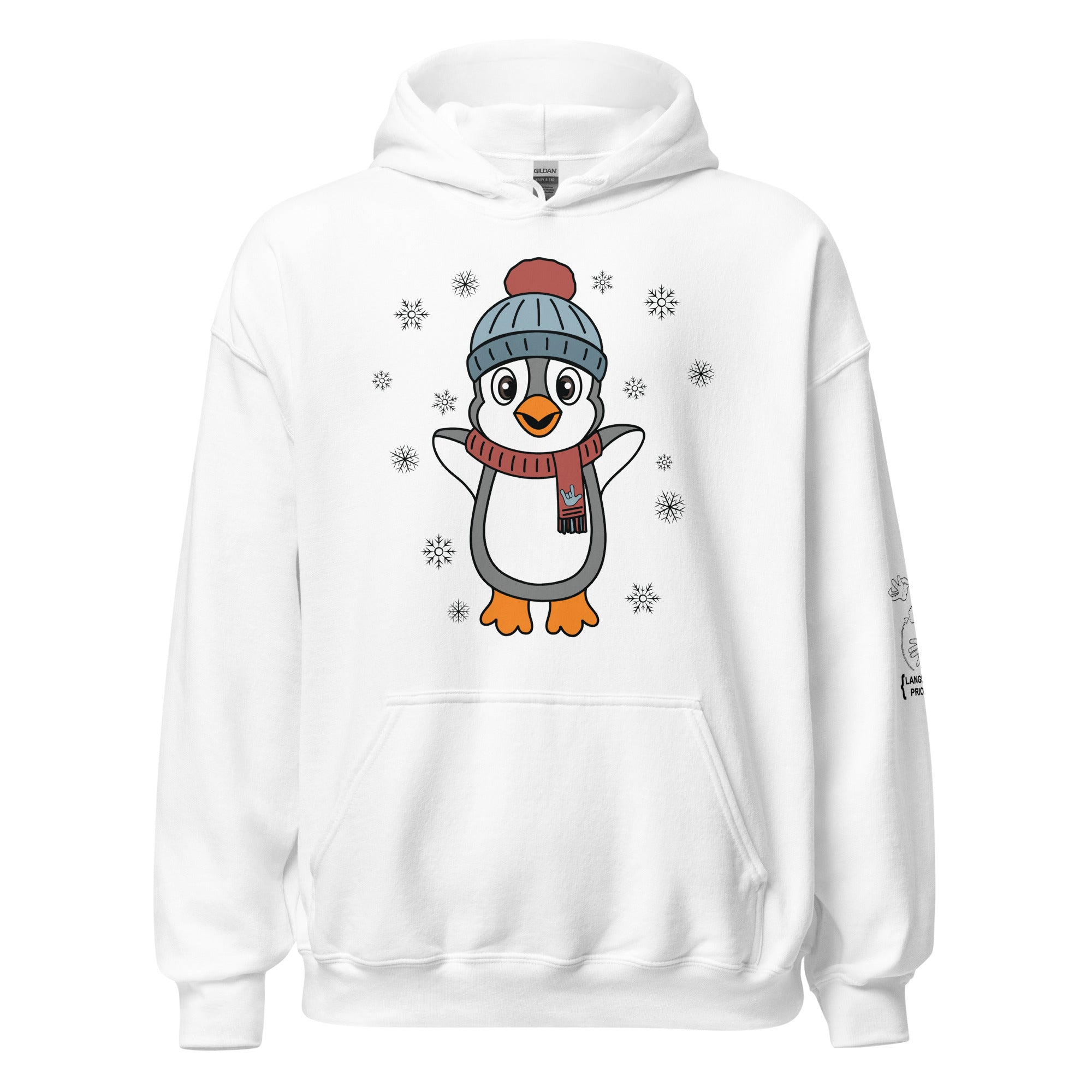 Bundle up in pure happiness with our “Joyful Penguin” hoodie! This charming design features an irresistibly cheerful penguin, bundled in a cozy beanie and a festive scarf that proudly displays an ILY (I Love You) handshape. Surrounded by gently falling snowflakes, the little penguin appears to be jumping for joy, spreading winter cheer wherever they go.