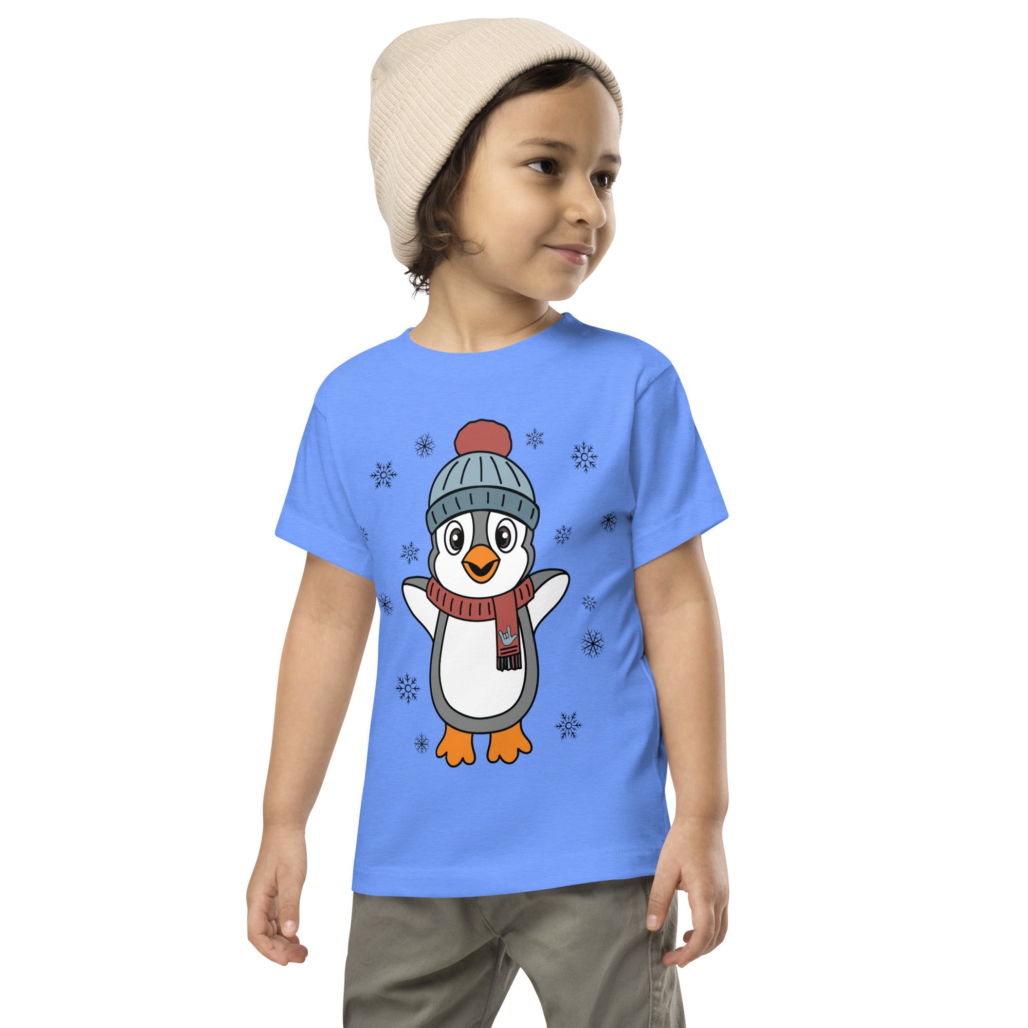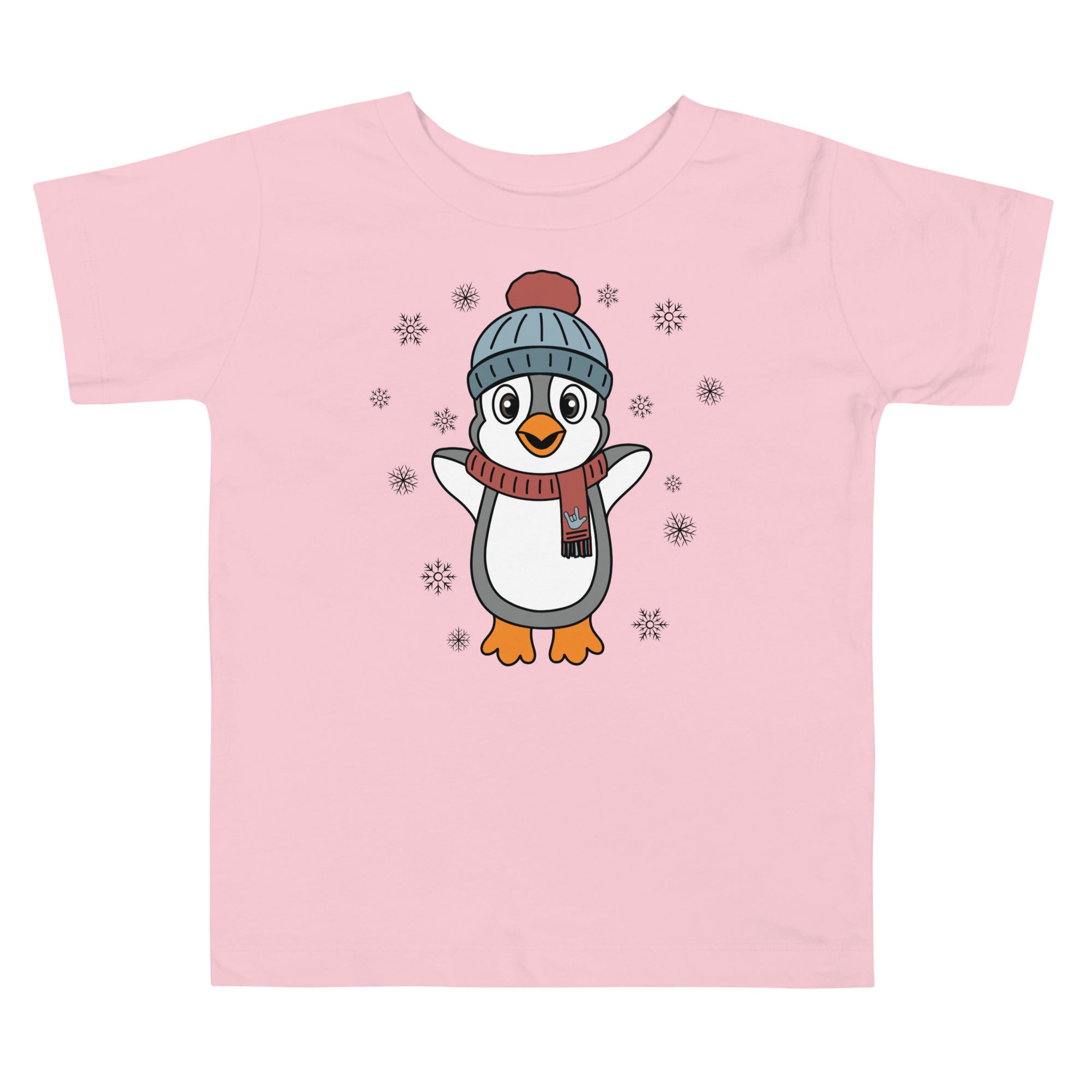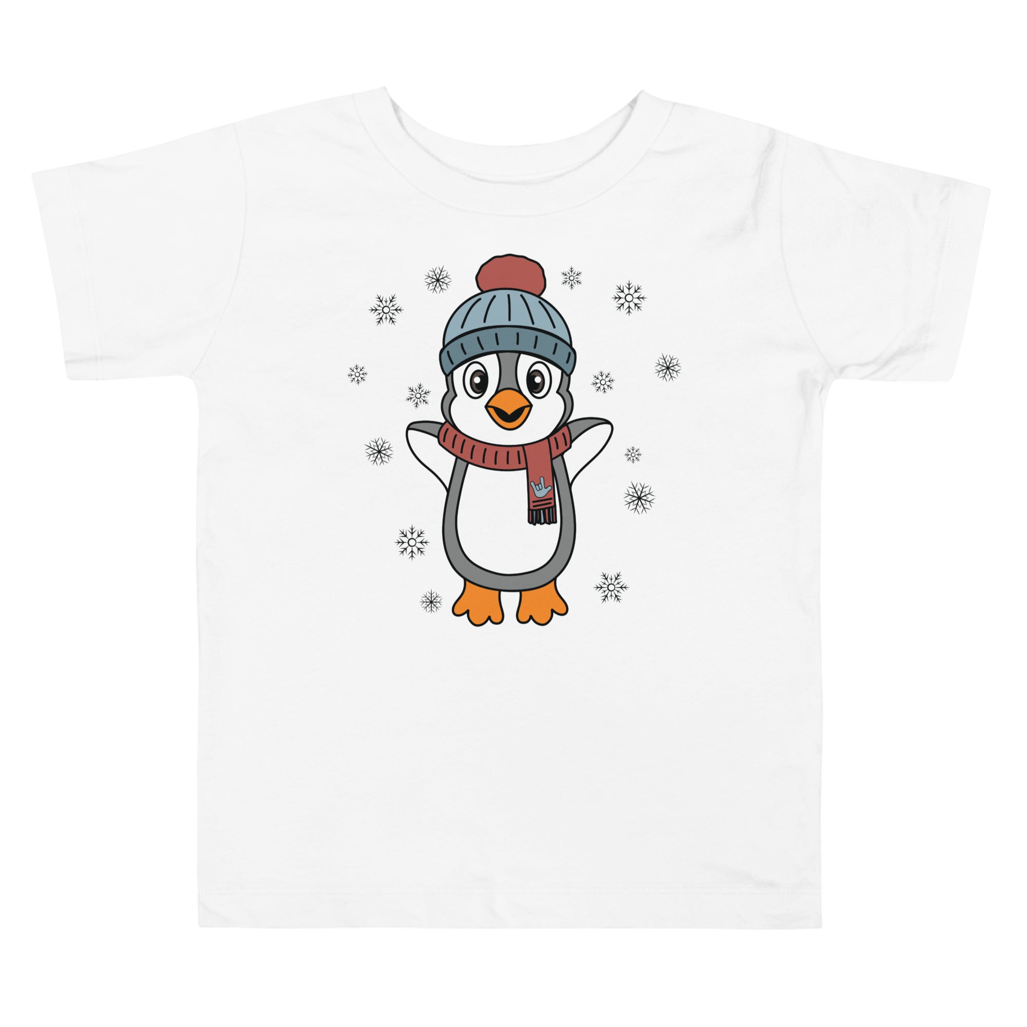 Bundle up in pure happiness with our “Joyful Penguin” toddler tee! This charming design features an irresistibly cheerful penguin, bundled in a cozy beanie and a festive scarf that proudly displays an ILY (I Love You) handshape. Surrounded by gently falling snowflakes, the little penguin appears to be jumping for joy, spreading winter cheer wherever they go.