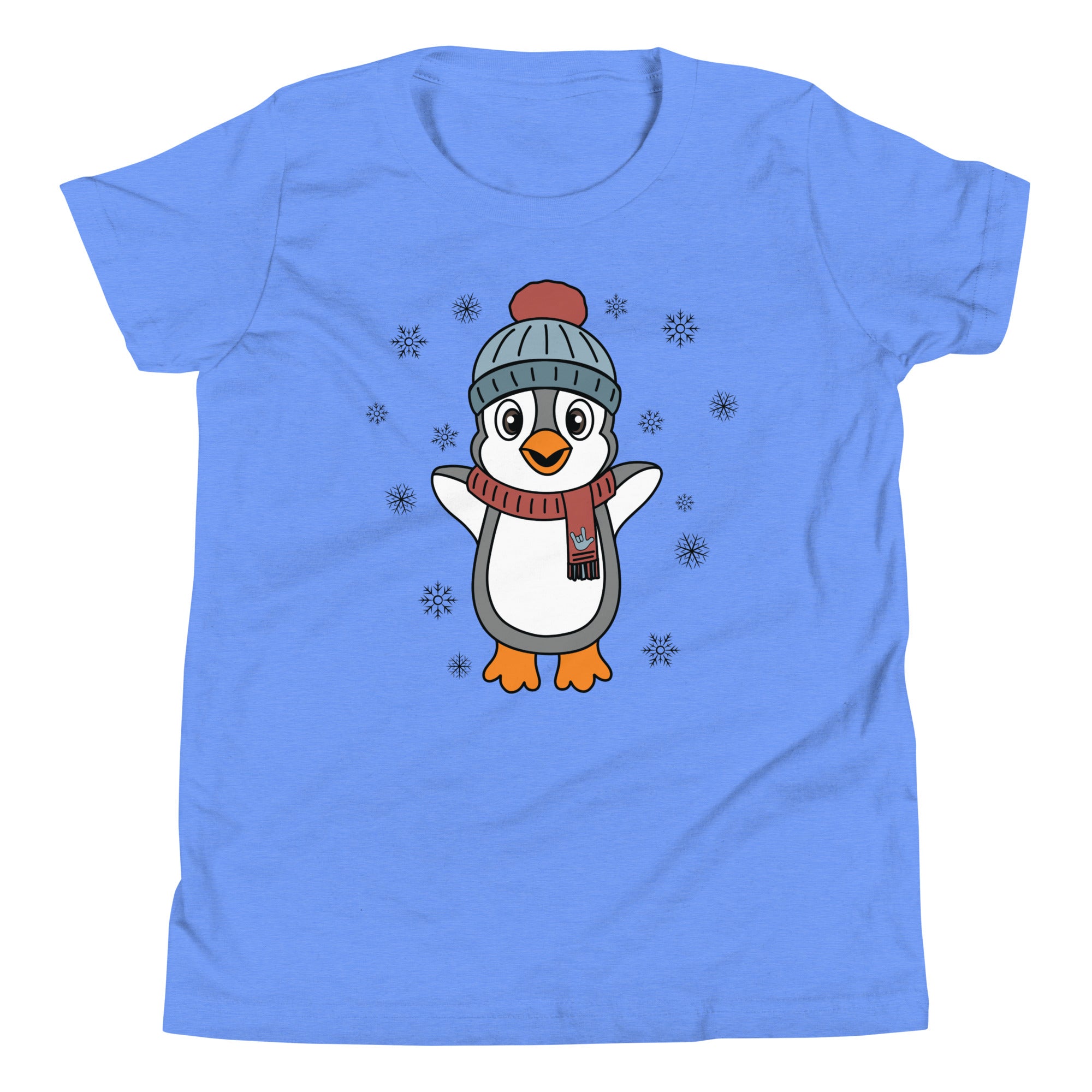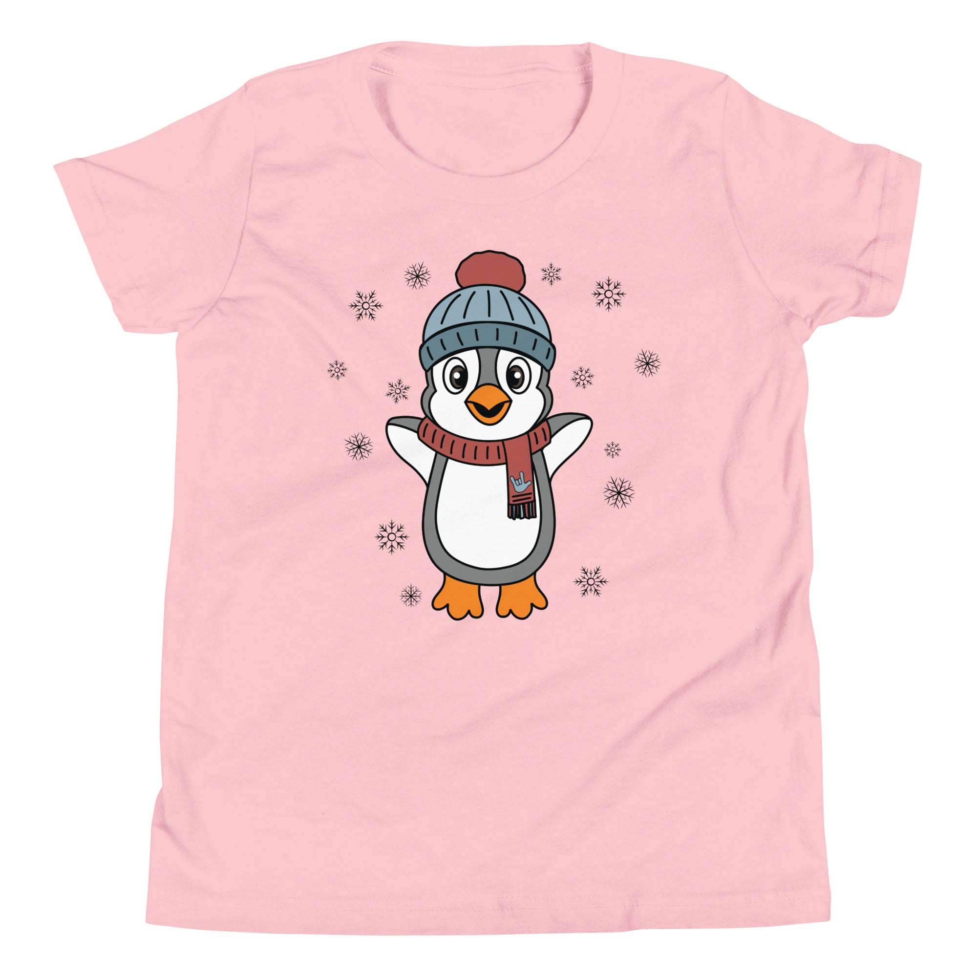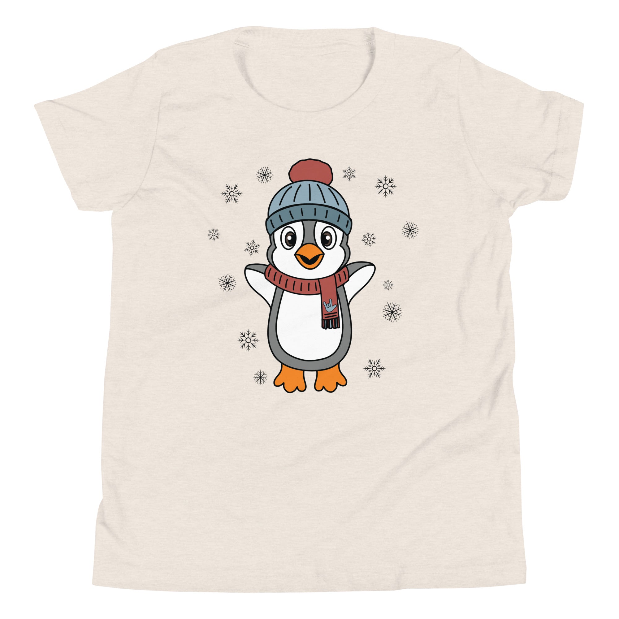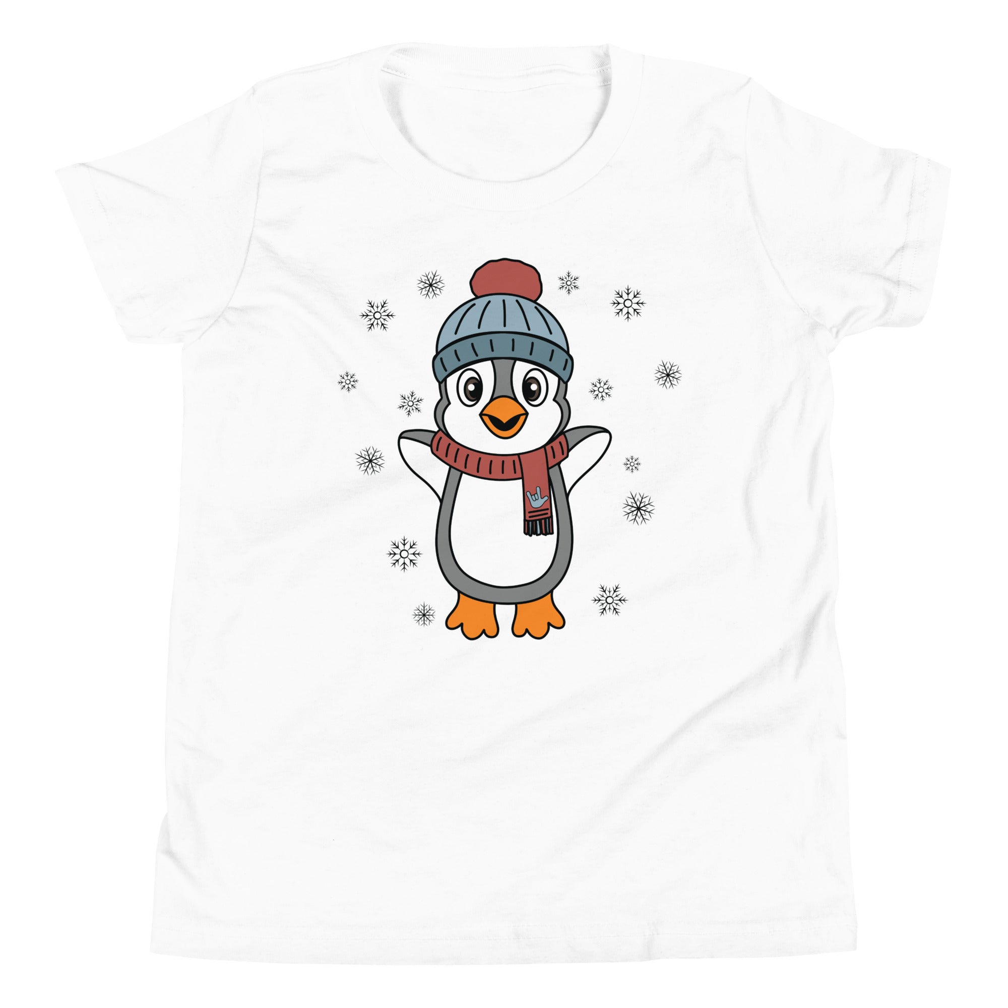 Bundle up in pure happiness with our “Joyful Penguin” youth tee! This charming design features an irresistibly cheerful penguin, bundled in a cozy beanie and a festive scarf that proudly displays an ILY (I Love You) handshape. Surrounded by gently falling snowflakes, the little penguin appears to be jumping for joy, spreading winter cheer wherever they go.
